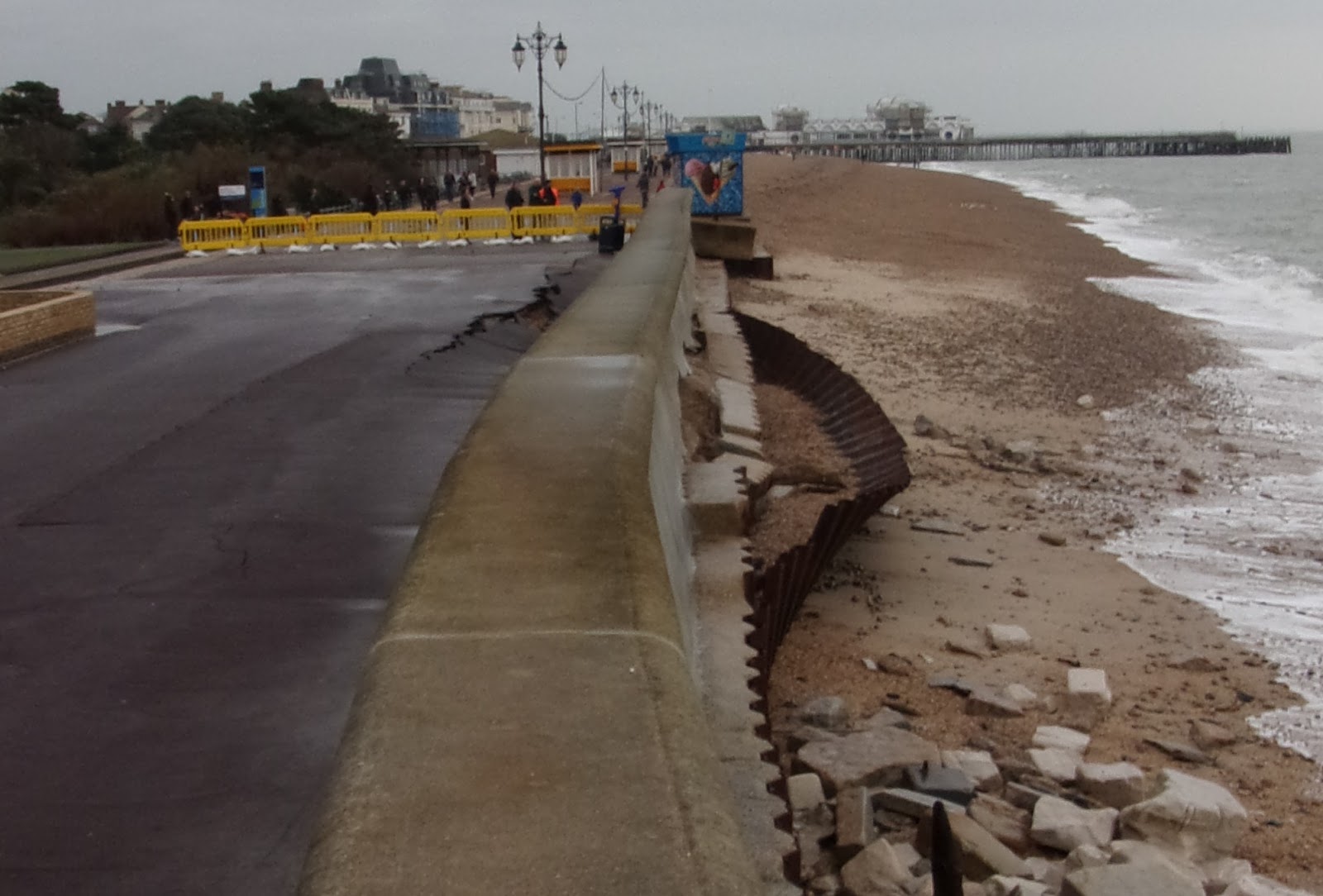 Outside the Pyramids Centre we found where the naughty sea had pulled away the corrugated iron retaining curtain, exposing the concrete underbelly and allowing the sea to smash rocks against the gravel overlay, excavating a big old hole down which some pavement and one of those big metal seafront bins had fallen.